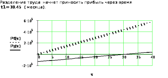 Из полученного графика следует, что линии прибыли пересекаются примерно через 120 дней после проведения комплекса организационно–технических мероприятий. Приравняв значения прибыли и решив полученное уравнение относительно времени, получим: