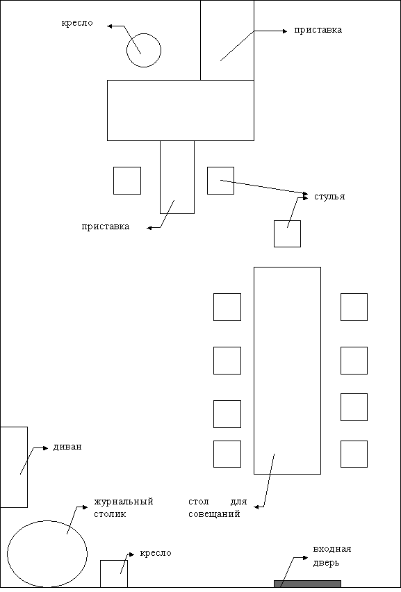 Размер площади и оборудование кабинета руководителя зависят от количества участников совещаний или заседаний, проводимых в кабинете руководителя, от количества одновременно приходящих посетителей, номенклатуры и объема дел и документов, различных технических средств и рабочих материалов, таблиц, т.е. планировка кабинета руководителя может быть различной в зависимости и от характера, и объема работы. Разработано несколько типовых рабочих мест для различных категорий руководителей, и с этими проектами надо ознакомиться, решая вопрос о рабочем месте.