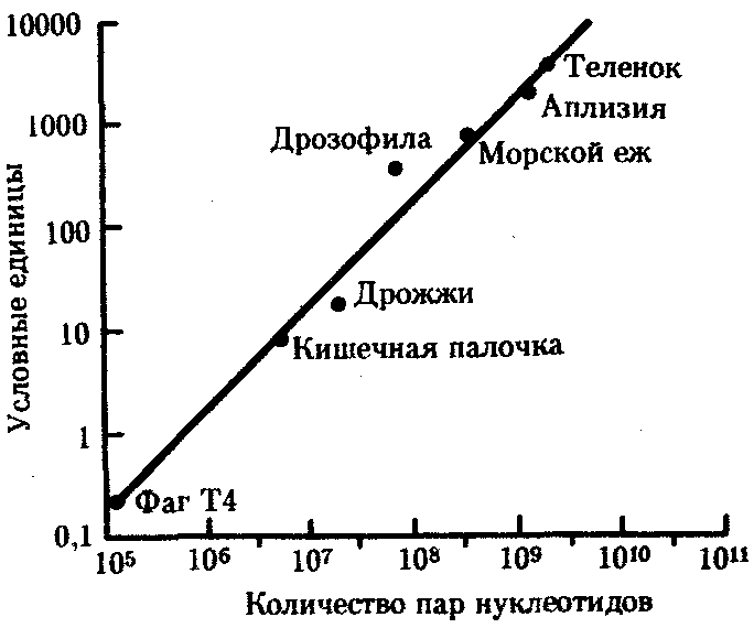 Рис. 1. Изменение объема уникальных нуклеотидных последовательностей в геномах в процессе прогрессивной эволюции