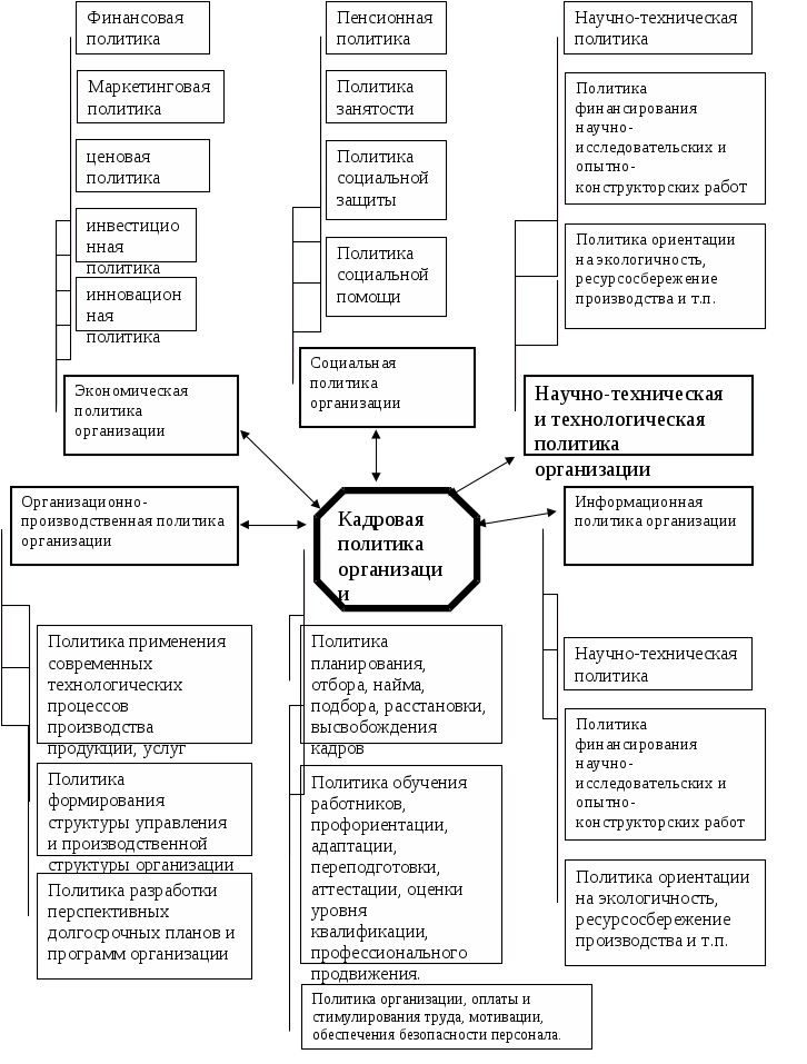Для достижения поставленных целей особенно важно обеспечить требуемое организации производственное поведение каждого из ее сотрудников. Как и стратегия развития организации в целом, кадровая политика разрабатывается с учетом ресурсов и традиции организации и возможностей, предоставляемых внешней средой. Кадровая политика является частью политики организации и должна полностью соответствовать концепции ее развития. Место и роль кадровой политики в политике организации наглядно отображено в блок-схеме на рис.1.