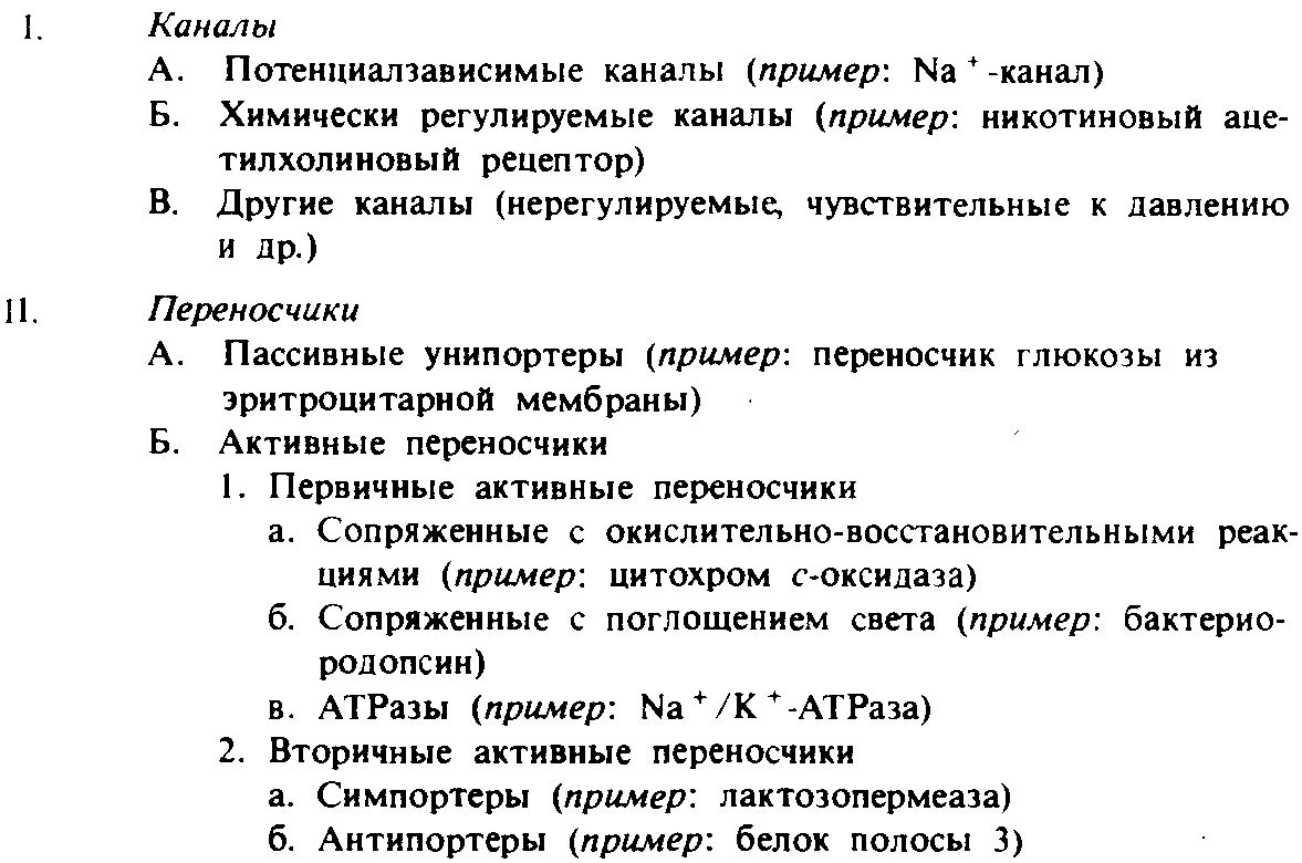 Фосфолипидный биослой является очень эффективным барьером для множества небольших растворимых молекул. Тем не менее через плазматическую мембрану, а также через мембраны, ограничивающие различные органеллы (например, митохондрии), постоянно транспортируются полярные вещества и ионы. Этот транспорт целиком опосредован белками, и для объяснения механизма переноса растворимых веществ через мембрану было предложено много моделей. Будет полезно ввести несколько терминов, использующихся для характеристики белков или структур, участвующих в трансмембранном транспорте. В табл.1 дается классификация транспортных белков. Прежде всего их подразделяют на каналы (или поры) и переносчики. Поры и каналы часто изображают в виде туннелей через мембрану, в которых места связывания транспортируемых растворимых веществ доступны с обеих сторон мембраны одновременно. Канальные белки не претерпевают никаких конформационных изменений в процессе переноса растворимых веществ с одной стороны мембраны на другую. Напротив, конформация переносчиков в процессе транспорта различных веществ изменяется. Переносимое вещество связывается с одной стороны мембраны, и для высвобождения его с другой стороны в переносчике должно произойти определенное конформационное изменение. При этом в любой момент времени место связывания вещества доступно только с одной стороны мембраны.