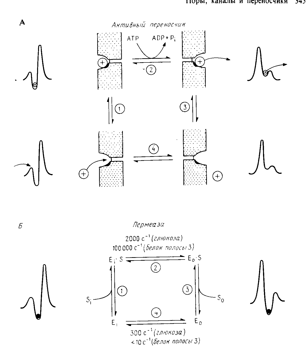 Как уже отмечалось, в основе кинетических моделей многих первичных активных транспортных систем лежит концепция чередования конформационных изменений. При этом совершенно необязательно, чтобы реакция, в ходе которой высвобождается энергия, например реакция гидролиза АТР, была прямо сопряжена с конформационным переходом, необходимым для транспорта; важно лишь, чтобы такое сопряжение существовало с одной или несколькими стадиями кинетического цикла. Требования, предъявляемые к структуре трансмембранного "канала" первичного активного переносчика, аналогичны таковым для других переносчиков, но здесь возникает дополнительная сложность - необходимость контроля сопряжения химической реакции, в ходе которой высвобождается энергия, и транспорта растворимого вещества.