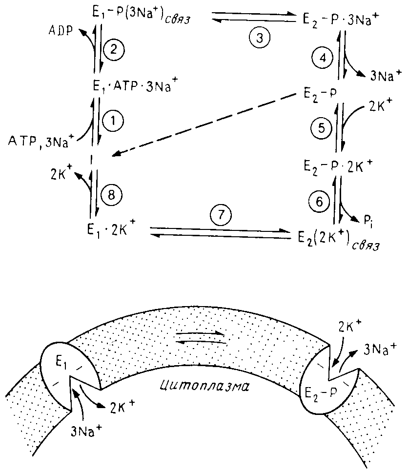 Название "фермент Е1E2-типа" было введено в работе, посвященной Na+/К+-АТРазе. Как показали исследования, этот белок существует по меньшей мере в двух различающихся конформациях, для которых характерны разное связывание субстратов и неодинаковая подверженность мягкому протеолизу. Форма Е1 соответствует конформации, в которой места связывания ионов обращены в сторону цитоплазмы (высокое сродство к Na+, низкое - к К+) и которая обладает высоким сродством к АТР. Места связывания ионов в фосфорилированной форме Е2 обращены наружу (высокое сродство к К +, низкое-к Na +). На рис.3 изображен транспортный цикл, в котором участвуют две ненагруженные формы переносчика и две нагруженные, Е2 (2К+) связи E1 (3Na+) связь со "спрятанными" внутри насосного комплекса ионами. Изучение связывания К+ фосфорилированной формой переносчика (Е2-Р) показало, что оно происходит в двух разных местах.