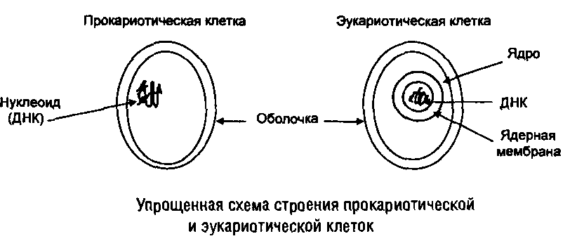 Ядро (нуклеоплазма) эукариотических клеток окружено двойной мембраной (плазмолеммой), содержащей поры (поросомы). В ядре присутствует ядрышко (место синтеза РНК и сборки рибосом). В отличие от ядра нуклеоид прокариотических клеток не отделен мембраной от цитоплазмы и представляет собой комплекс ДНК, РНК и белков.