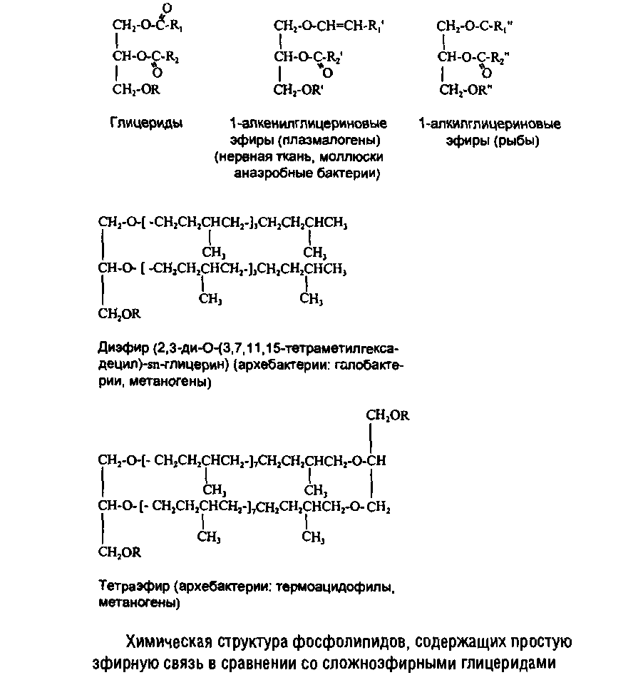Соотношение различных классов фосфолипидов в мембране существенно зависит от условий выращивания организма. Например, при снижении рН среды в мембранах бактерий начинают преобладать положительно заряженные фосфолипиды (аминоацилфосфатидилглицерины, фосфатидилэтаноламин), наличие которых существенно уменьшает проницаемость мембраны для протонов. В большинстве случаев фосфолипиды представляют собой сложные эфиры глицерина или других многоатомных спиртов, но существуют липиды, в которых одна из спиртовых групп глицерина образует простую эфирную связь с ал килами или алкенами. Необычные липиды найдены у большой группы прокариот, так называемых архебактерий (или архей), в качестве простых эфиров глицерина и длинноцепочечных С-20, С-40-гидроизопреноидных спиртов (полипренолов), точнее, дифитанилдиглицериновых диэфиров или дибифитанилдиглицериновых тетраэфиров (рис. 6).