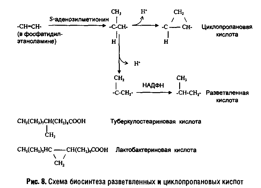 В мембранах прокариот разнообразие жирных кислот довольно велико. Особенностью бактерий является наличие разветвленных и циклопропановых кислот. У некоторых грамположительных бактерий (например, Micrococcus luteus) 90% жирных кислот липидов составляют разветвленные кислоты, а ненасыщенные кислоты практически отсутствуют. Грамотрицательные бактерии содержат смесь насыщенных и ненасыщенных кислот с преобладанием С-16 и С-18 кислот, а также циклопропановые кислоты (например, лактобацилловую кислоту). Пути их биосинтеза показаны на рис. 8.