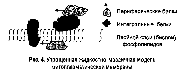 Цитоплазматическая мембрана состоит из белков и липидов в соотношении от 1: 4 (в миелине, мембране нервных волокон) до 4:1 (в мембранах бактерий). Во многих мембранах присутствуют небольшие количества углеводов (до 5%) и следы РНК, а также неорганические катионы (в основном Са2+ и Mg2+). Существенную часть мембран составляет вода — она участвует в формировании гидрофобных (энтропийных) связей между компонентами мембраны. Еще в 1930 г. Д. Даниэлян предложил модель мембраны в виде двойного липидного слоя или бислоя. Развитием этих представлений является жидкостно-мозаичная модель, предложенная С.Д. Сингером и Г. Николсоном в 1972 г., согласно которой мембранные белки подразделяются на периферические (слабо связанные с мембраной) и интегральные (локализованные в липидном бислое). Последние свободно плавают в «липидном море», перемещаясь в латеральном направлении (в плоскости мембраны), но неспособны «пронырнуть» на противоположную ее сторону. Таким образом, мембраны оказываются асимметричными, по крайней мере, в отношении белкового состава. Асимметрия наблюдается и в расположении липидов в мембране, но менее выражена. Некоторые из интегральных белков имеют трансмембранную ориентацию и выполняют функции переносчиков субстратов или сигналов. Схема подобной мембраны представлена на рис. 4.