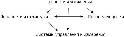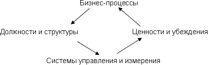 По мнению Майкла Хаммера , структуру организации определяют процессы. Способы выполнения работы (бизнес-процессы), определяют характер должности, а также группировку и организацию исполнителей работ (должности и структуру). Сотрудников для выполнения работ по процессам надо нанимать, оценивать и оплачивать с помощью соответствующих систем управления и измерения. А системы управления – то, как оплачивается труд сотрудников, оценивается их эффективность и т.д. – главный фактор, определяющий ценности компании и убеждения ее персонала (Рис. 1.1.).