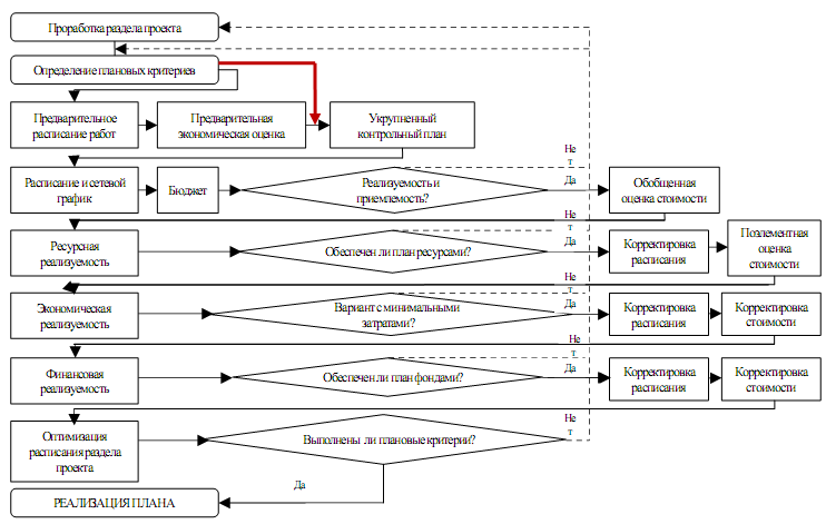 Аналогично этапам системного проектирования процесс планирования реализации проекта должен состоять из следующих этапов: анализ потребности в планах, формулирование задачи планирования, формулирование или выбор критериев планирования, разработка альтернативных планов, Анализ физической (ресурсной) реализуемости, анализ экономической реализуемости плана, анализ финансовой реализуемости плана, оптимизация, оценка и выбор наилучшего варианта плана, реализация плана, использования обратной связи и управление.