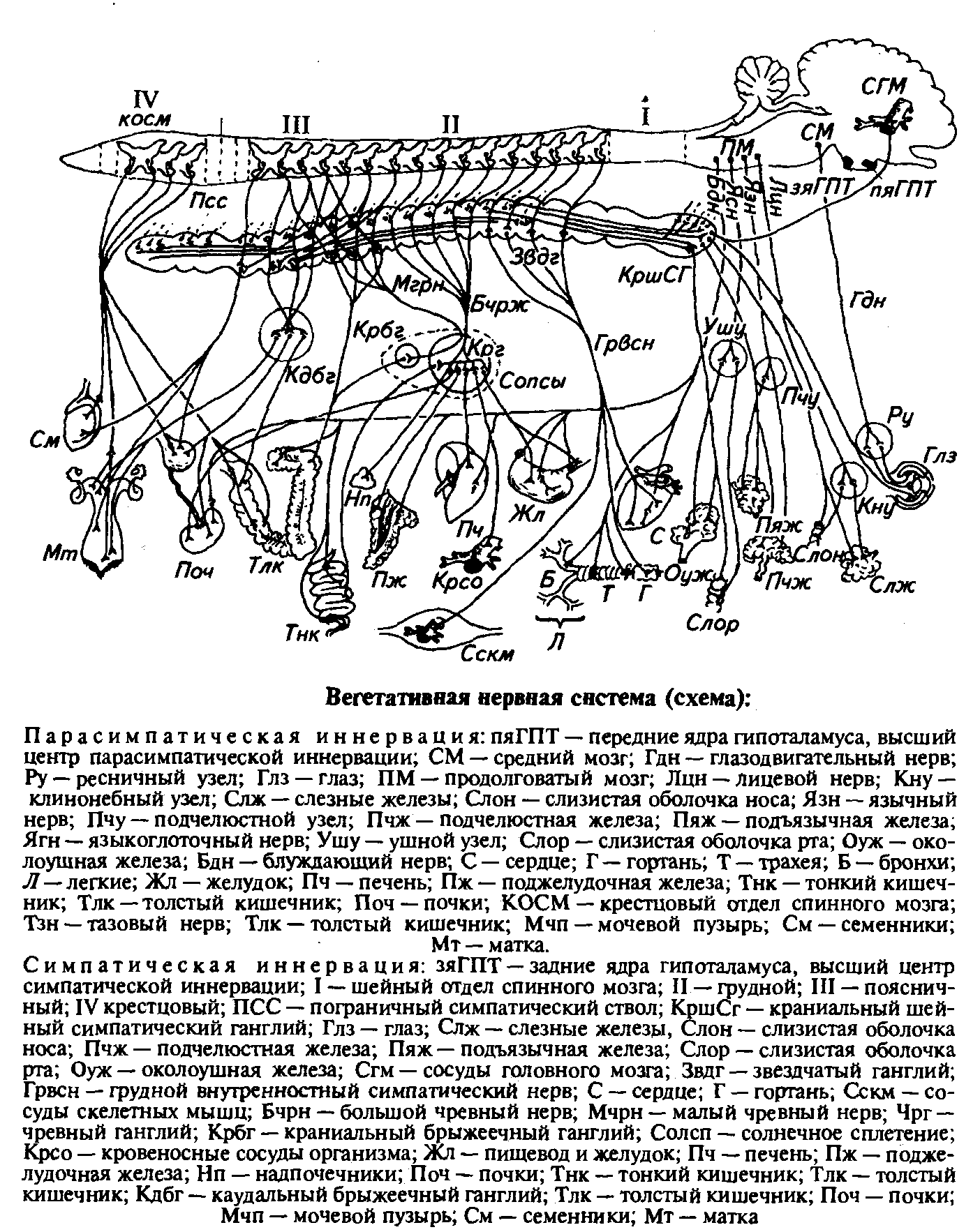 Парасимпатическая иннервация образована парасимпатическими нейронами среднего, продолговатого мозга и крестцового отдела спинного мозга, а также парасимпатическими нейронами ганглий, расположенных чаще в органах.