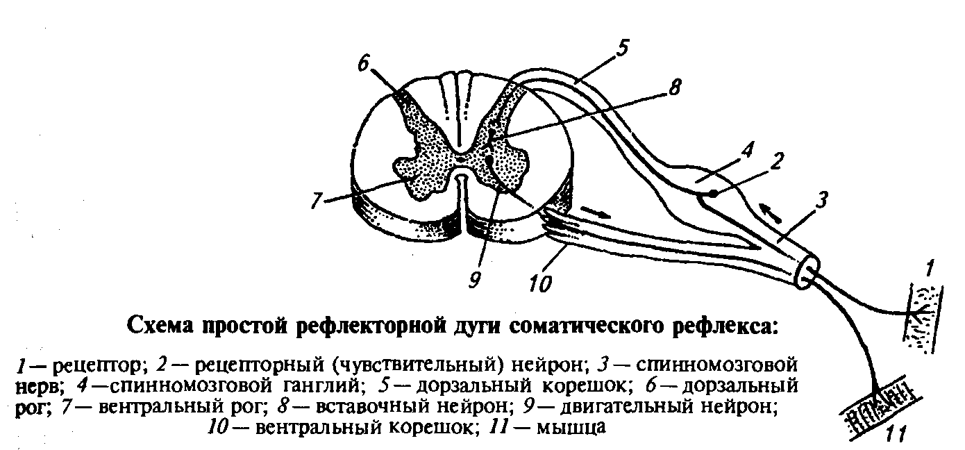 Рефлекс осуществляется через специальное структурное образование нервной системы, которое называется рефлекторной дугой. В образовании рефлекторной дуги участвуют три вида нейронов: чувствительные, контактные и двигательные