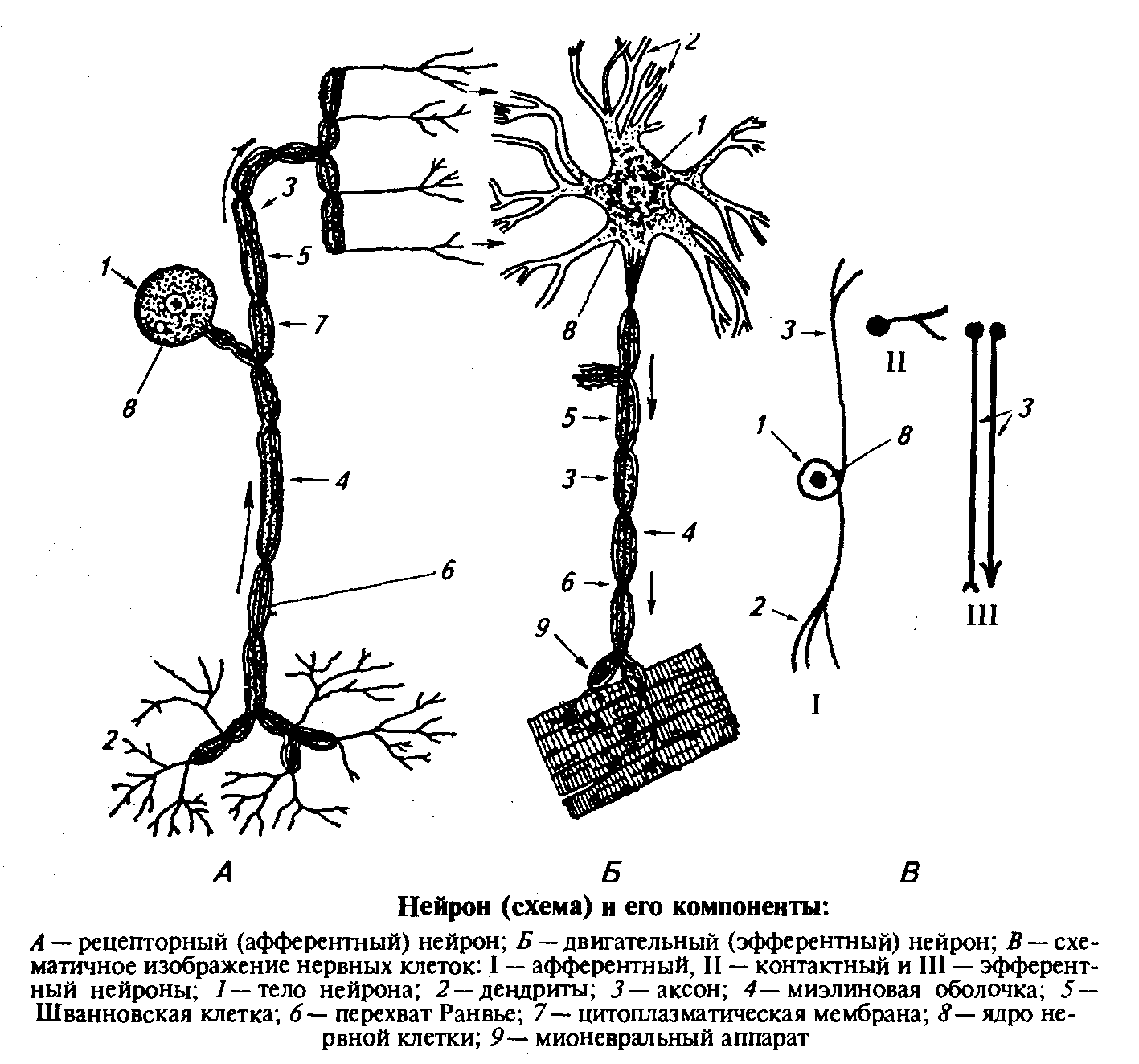 Нейрон. Состоит из тела и отростков: одного аксона и нескольких дендритов. В теле нейрона синтезируются медиаторы, клеточные белки и другие компоненты. Оно выполняет трофическую роль по отношению к отросткам. Отростков два вида: длинный неветвящийся аксон и короткие ветвящиеся дендриты. Аксон проводит возбуждение от тела нейрона к нервным, мышечным и секреторным клеткам, а дендриты — к телу нейрона.