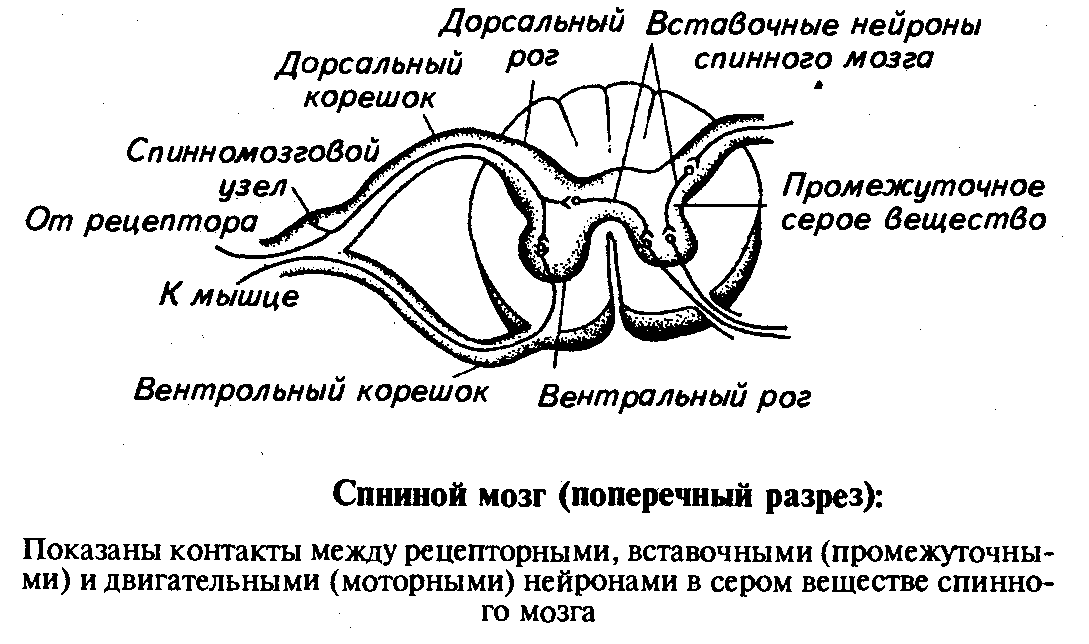 Спинной мозг расположен в позвоночном канале и представляет собой цилиндрический тяж с дорсальными и вентральными корешками. Он переходит в ствол головного мозга. Спинной мозг — структурно-физиологическое образование ЦНС из нейронов. Тела нейронов формируют серое вещество спинного мозга, а отростки нейронов — белое вещество. По физиологической роли различают три вида нейронов спинного мозга: промежуточные, моторные и вегетативные. Нейроны спинного мозга формируют исполнительные отделы нервных центров рефлекторных дуг рада рефлексов. Вентральные корешки называют двигательными, так как они содержат отростки двигательных нейронов, иннервирующие скелетные мышцы; дорсальные корешки — чувствительными: состоят из отростков рецепторных нейронов.