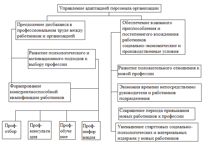 Для достижения этих целей в организациях целесообразно иметь в действующих подразделениях по управлению персоналом специалистов или самостоятельное подразделение по управлению профориентацией и адаптацией кадров. Штат такого подразделения должен состоять как минимум из двух человек: профконсультанта (профессиональная ориентация) и менеджера по персоналу (отбор, подготовка и адаптация работников). В осуществлении процесса адаптации непосредственное участие принимают линейные руководители.