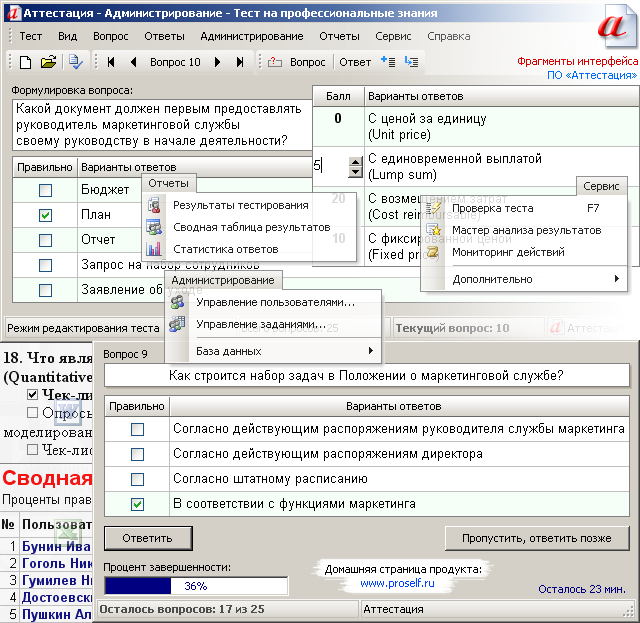 Для проведения автоматизированной аттестации персонала необходимо установить специальную компьютерную программу, например «Proself». Программа представляет собой удобную оболочку тестов с обширным функционалом и решает любые задачи так или иначе связанные с тестированием: аттестация персонала, тестирование при приеме на работу (подбор персонала), оценка и контроль знаний, аттестационное тестирование, конфиденциальное анкетирование персонала и так далее.