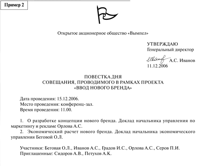 К повестке дня может быть приложен список приглашенных с указанием их должностей. Так поступают при организации крупных совещаний, на которых присутствует большое количество участников. Это активно практикуется в федеральных органах исполнительной власти. В коммерческих же организациях участников совещания и приглашенных лучше вносить в повестку дня совещания, как это показано в Приложении 2.