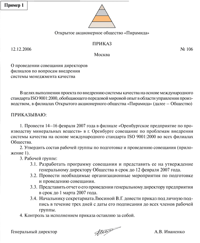 Если в подготовке совещания участвует несколько человек, то, как правило, на предприятии издается приказ о проведении совещания, в котором определяется состав рабочей группы и план его подготовки (см. приложение 1).