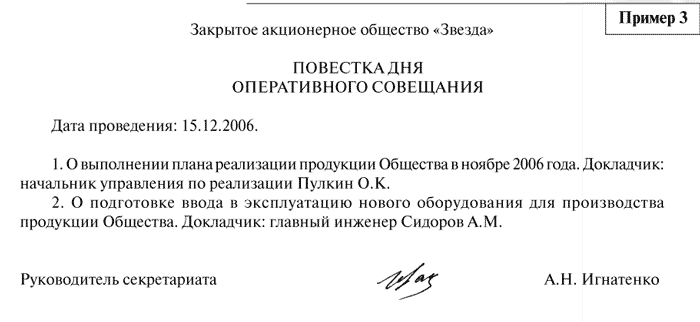 Составленная повестка дня утверждается руководителем, образец такого документа представлен в приложении 2. Но на практике довольно часто используется и упрощенная форма. Как видно из приложения 3, она не имеет грифа утверждения (встречаются даже варианты оформления без подписи ответственного исполнителя), но именно такие формы повесток являются самыми распространенными. Первая форма более информативна, содержит сведения о месте, дате проведения и участниках совещания, имеет гриф утверждения. Поэтому можно рекомендовать использовать ее для наиболее важных совещаний, а для проведения рабочих и оперативных повестку дня может подписать и секретарь после предварительного устного обсуждения с председателем. Порядок оформления повестки дня закрепляется в Регламенте по проведению совещаний, если таковой на предприятии имеется./1, с.81/