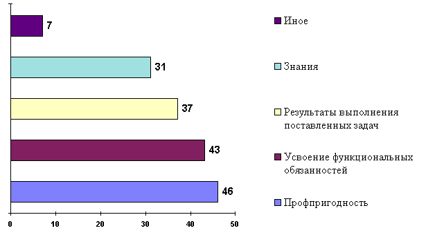 Наиболее эффективной, с точки зрения респондентов, является оценка результатов выполнения новыми сотрудниками поставленных задач - 78 % и реальные знания - 77 %. Кроме того компании считают эффективной оценку того, насколько новичок усвоил свои функциональные обязанности - 72 % [21].