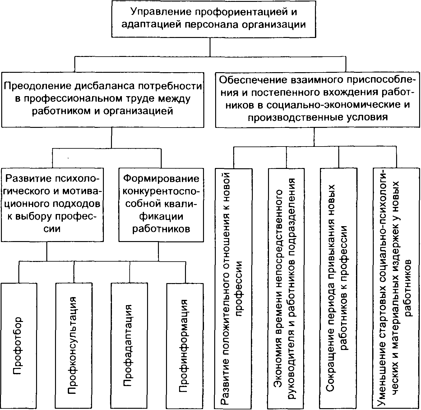 Относительно полно эти задачи сформулированы Кибановым. В своем учебном пособии он пишет, что главной задачей адаптации должно стать преодоление дисбаланса потребности в профессиональном труде между работником и организацией. Ведь организация заинтересована в повышении конкурентоспособности своей продукции, а это требует отбора как высокоэффективных технологии и техники, так и наиболее способных работников. Чем выше уровень развития работника с точки зрения совокупности его профессиональных знаний, умения, навыков, способностей и мотивов к труду, тем быстрее совершенствуется и более производительно используется вещественный фактор производства [10].