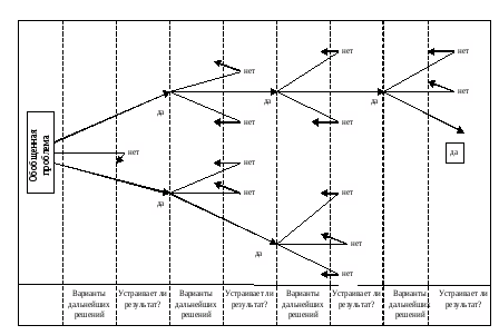 Наиболее простыми методами принятия управленческих решений являются двумерные списки. При данном методе определяются возможные варианты решения и определяются достоинства и недостатки каждого, а затем выбирается тот вариант, который имеет большее число достоинств и в наибольшей степени соответствует установленным критериям принятия решения. Достаточно наглядным методом принятия решения является дерево решений. Он позволяет руководителю визуально оценить результаты действия различных решений и выбрать наилучший их набор. Данный метод использует модель разветвляющего по каким-то условиям процесса. Общая идея «метода дерева» решений графически изображена на рисунке 5.