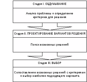 На этапе проектирования осуществляется систематический поиск возможных вариантов решения. На этапе выбора выбирается наилучший вариант, отвечающий всем заданным критериям. Более подробно схема принятия рационального решения представлена на рис 2. И хотя эта модель содержит большее число этапов, она полностью соответствует трех этапной модели Саймона.
