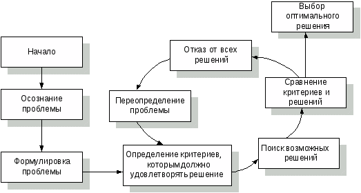 Решения, основанные на суждениях - это выбор, обусловленный знаниями, квалификацией или накопленным опытом. Эти решения не всегда эффективны, так как перенесение опыта прошлого на будущее не учитывает прошедших изменений. Такие решения носят догматический характер. Многие руководители доперестроечного периода, пытавшиеся перенести свой прошлый опыт на работу своих организаций в условиях рынка, потерпели неудачу. Рациональные решения – обосновываются с помощью объективного аналитического процесса, выстроенного в некий логический процесс. Согласно Саймону, процесс принятия решения складывается из трех этапов: