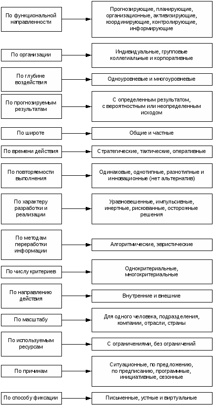 Особо следует выделить категорию «управленческие решения» - это решения связанные с выполнением управленческих функций: планирования, организации, мотивации и контроля. Эти решения могут реализовываться в форме распоряжения, деловой беседы, инструкции, проекта, плана. Решение называется управленческим, если оно разрабатывается, реализуется и направлено на: