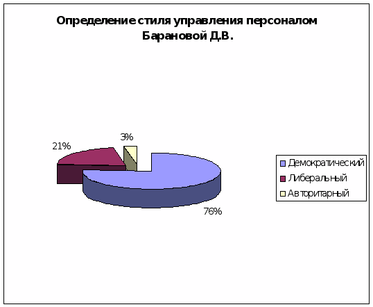 Как руководитель, Баранова Д.В. умеет координировать и направлять деятельность коллектива, развивает инициативу и новые методы работы. Она оказывает моральную поддержку сотрудникам, справедлива и тактична в профессиональных спорах, предупреждает конфликты и создает доброжелательную атмосферу в коллективе.