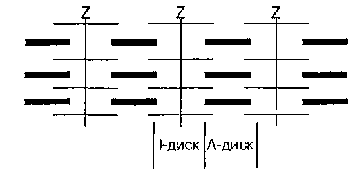 Светлые участки миофибрилл состоят из центральных частей тонких нитей. Они сравнительно легко пропускают лучи света или поток электронов, так как не обладают двойным лучепреломлением и называются изотропными, или светлыми, дисками. В середине пучка тонких нитей поперечно располагается тонкая пластинка из белка, которая фиксирует положение мышечных нитей в пространстве. Эта пластинка хорошо видна под микроскопом в виде линии, идущей поперек I-диска, и названа Z-пластинкой, или Z-линией.