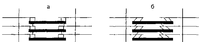 а - образовавшиеся мостики между толстыми и тонкими нитями располагаются под углом 90°; б - после поворота мостики оказываются под углом 45°