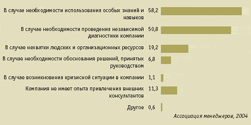 В случае же дефицита финансов большинство руководителей этого сектора вообще не думают о консалтинге – их предприятиям не хватает средств даже на решение текущих проблем. Именно такая ситуация складывается в сельском хозяйстве, угольной промышленности, на многих машиностроительных и транспортных предприятиях. Более всего бизнес привлекает возможность использования знаний и навыков, которыми обладают профессиональные консультанты (это отмечают почти 60% опрошенных). Без внешних консультантов не обойтись в случае необходимости проведения независимой диагностики компании. Более 50% респондентов указывают на то, что прибегают к услугам внешних консультантов для получения непредвзятого «снимка» организации. Эти управленцы небезосновательно полагают, что оценка решения со стороны внешнего эксперта поможет избежать неконструктивных возражений и сопротивления персонала. Всего несколько человек указали на использование услуг консультантов в случае возникновения кризисной ситуации в компании.