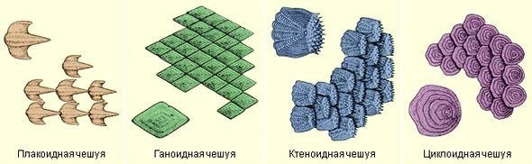 Снаружи тело костных рыб покрыто чешуёй: плакоидной (зубы, уложенные «в паркет»), ганоидной (ромбические пластинки с шипом), циклоидной (тонкие пластинки с гладким краем) или ктеноидной (пластинки с шипиками), периодически сменяющейся по мере роста животного. Годичные кольца на ней позволяют судить о возрасте рыбы.