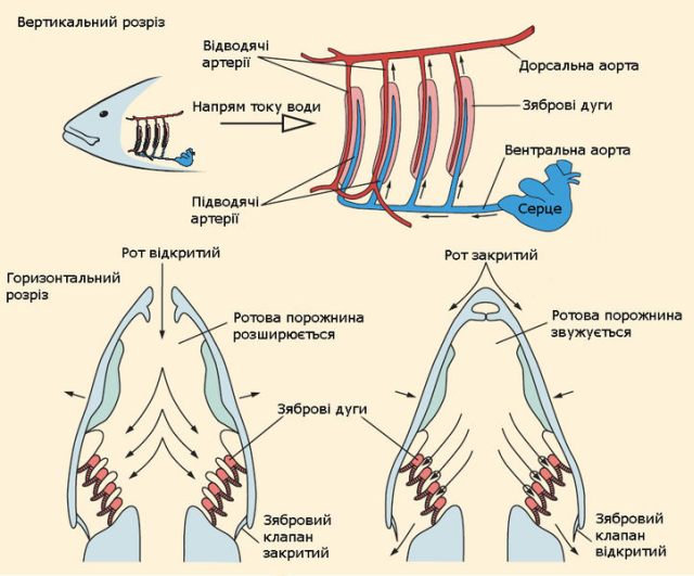 Основным органом газообмена рыб являются жабры, которые расположены по сторонам ротовой полости. У костистых рыб они закрыты жаберной крышкой, у других классов – свободно открываются наружу. Во время вентиляции жабров вода попадает в ротовую полость через рот, а затем проходит между жаберными дугами и выходит наружу из-под жаберных крышек. Анатомически жабры состоят из полупроницаемых мембран и кровеносных сосудов, которые расположены на костных жаберных дугах. Специфической структурой, приспособленной для газообмена, являются жаберные лепестки, где под тонким эпителием находятся сильно разветвленные капилляры.