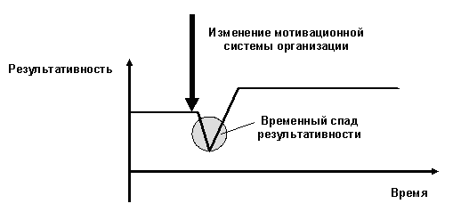 2. Отсутствие немедленных улучшений производственных показателей. Когда руководитель, начинающий рационализировать систему мотивации, оказывается в точке "хуже, чем было", то часто он считает, что сделал что-то не то или не так. В результате возникают сомнения в собственных способностях, в привлеченных консультантах, в самой реализуемой идее. Следует учитывать, что временное ухудшение - это нормально. Ведь почти всегда сразу после неких перемен происходит психологическая дестабилизация персонала, которая не может не сказаться на производительности. Зато потом часто наблюдается быстрый рост (см. рис. 2.39).