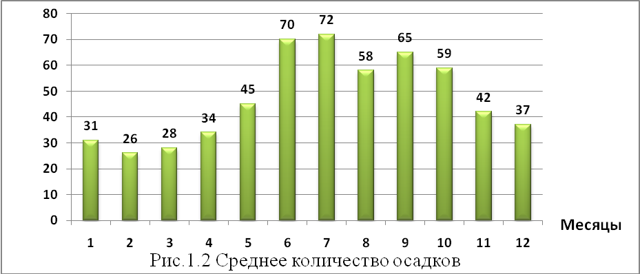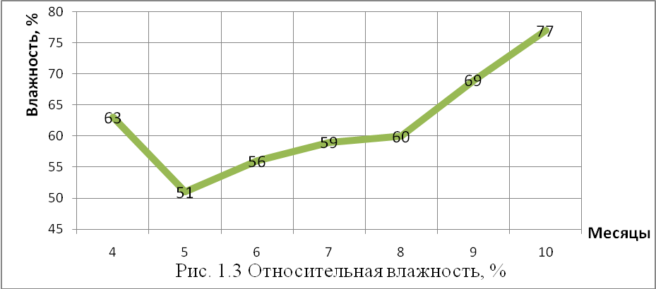 Также большое влияние на урожайность оказывают осадки и снежный покров. Особенно весной во время посевной, когда постоянно идет дождь, и нет возможности для проведения посевных работ, а раньше начинать сев также не позволяют климатические условия, в связи с поздним оттаиванием почв. Среднее количество осадков изображено на рис. 1.2, а относительная влажность на рис. 1.3.