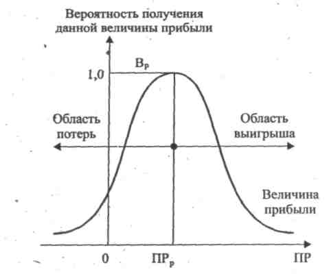 Чтобы установить вид кривой вероятности потерь, рассмотрим прибыль как случайную величину и построим кривую распределения вероятностей получения определенного уровня прибыли (рис. 2).