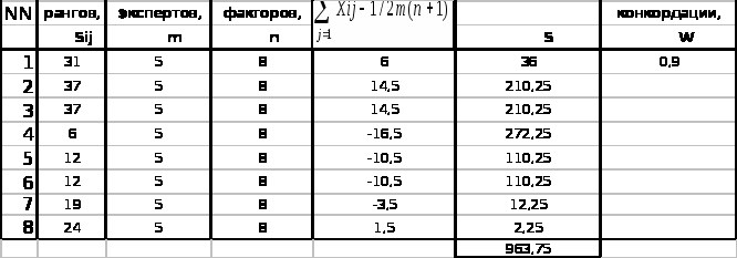 Коэффициент конкордации W может принимать значения в пределах от 0 до 1. При полной согласованности мнений экспертов коэффициент конкордации равен 1. При полном разногласии - 0. При величине W менее 0,7 необходимо определить того эксперта, мнение которого резко отличается от других, и либо добиться сближения его позиции с позициями других экспертов, либо убедить их в изменении своих мнений.
