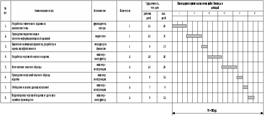 Календарное планирование инновационных проектов на стадиях проведения НИОКР имеет своей целью установление взаимосвязанных сроков начала и окончания работ по каждой теме с учётом имеющихся ресурсов. Календарное планирование отдельных НИОКР включает определение состава и последовательности этапов НИОКР, трудоёмкости, длительности и календарных сроков их выполнения, составление календарных планов-графиков работ по выполнению каждой темы, определение затрат и результатов от использования инноваций.
