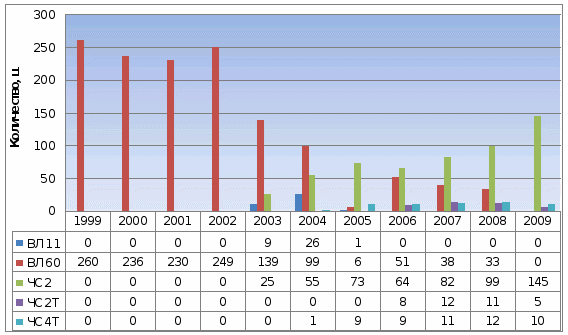 Далее, на основе данных производственной программы на 2011 год определяем общее количество двигателей, подлежащих ремонту. Количество ремонтируемых локомотивов ЧС–2 намечено в размере 72, кроме того, запланирован ремонт 53 комплектов электрооборудования для ЧС–2.