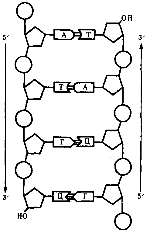 Другой важной особенностью объединения двух полинуклеотидных цепей в молекуле ДНК является их антипараллельность: 5'-конец одной цепи соединяется с 3'-концом другой, и наоборот (рис.4).
