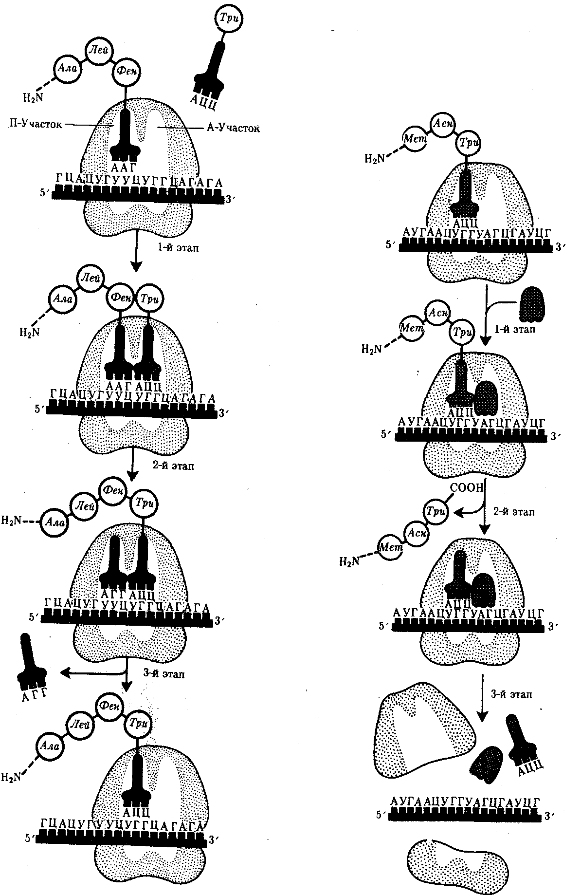 Благодаря особенностям трехмерной организации тРНК при соединении ее антикодона с кодоном мРНК. транспортируемая ею аминокислота располагается в А-участке, поблизости от ранее включенной аминокислоты, находящейся в П-участке. Между двумя аминокислотами образуется пептидная связь, катализуемая особыми белками, входящими в состав рибосомы. В результате предыдущая аминокислота теряет связь со своей тРНК и присоединяется к аминоацил-тРНК, расположенной в А-участке. Находящаяся в этот момент в П-участке тРНК высвобождается и уходит в цитоплазму (рис.33). Перемещение тРНК, нагруженной пептидной цепочкой, из А-участка в П-участок сопровождается продвижением рибосомы по мРНК на шаг, соответствующий одному кодону. Теперь следующий кодон приходит в контакт с А-участком, где он будет специфически "опознан" соответствующей аминоацил-тРНК, которая разместит здесь свою аминокислоту. Такая последовательность событий повторяется до тех пор, пока в А-участок рибосомы не поступит кодон-терминатор, для которого не существует соответствующей тРНК.