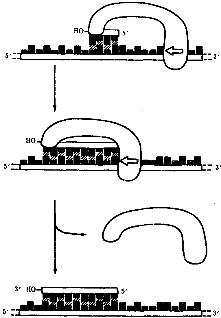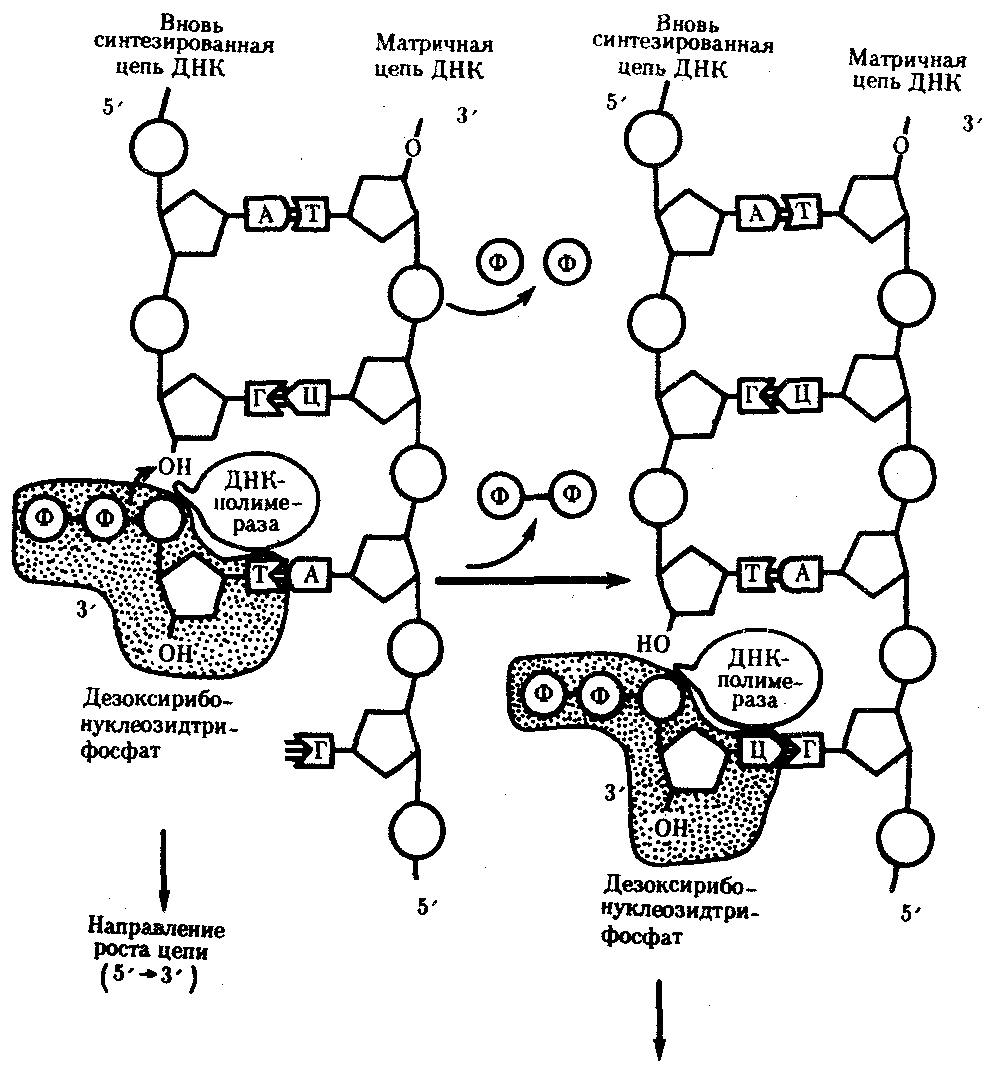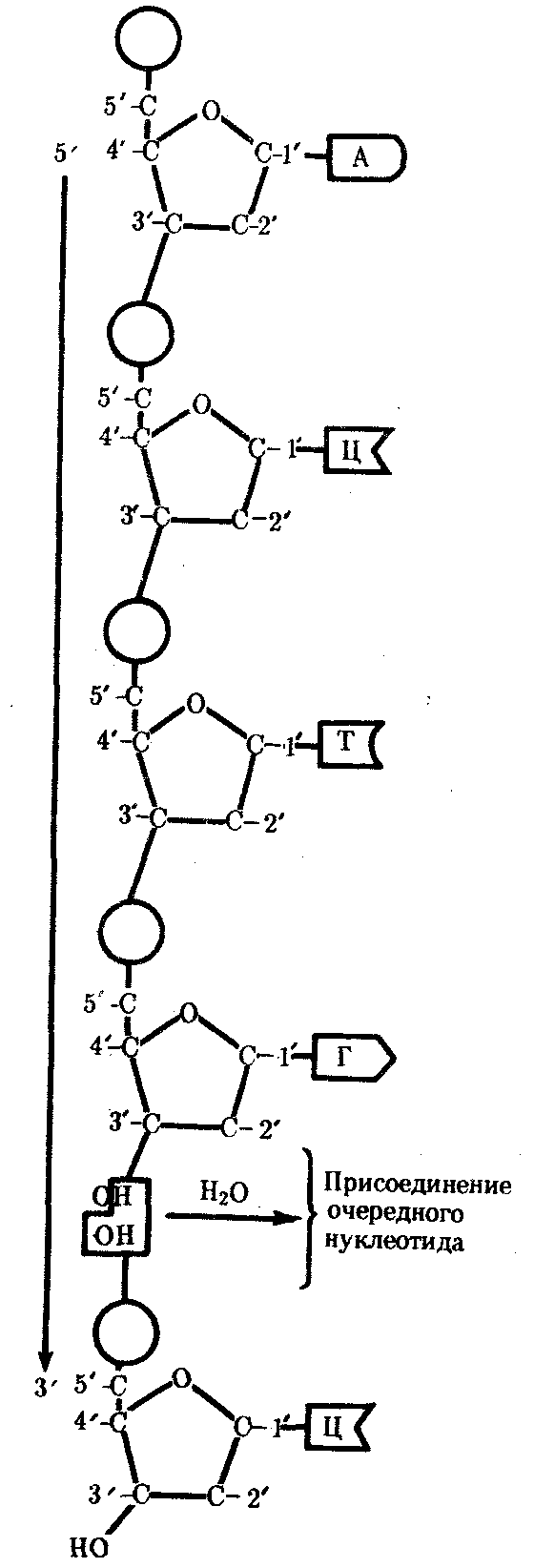 Поскольку ДНК-полимераза присоединяет очередной нуклеотид к ОН-группе в 3'-положении предшествующего нуклеотида, цепь постепенно удлиняется на ее 3'-конце.