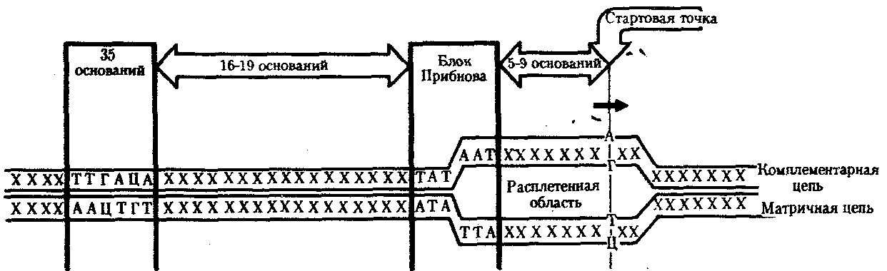 У прокариот обычно недалеко от стартовой точки против хода транскрипции располагается последовательность из шести нуклеотидов - ТАТААТ, называемая блоком Прибнова. Это среднестатистическая последовательность, состоящая из наиболее часто встречаемых оснований, самыми консервативными из которых являются 1,2 и 6-е основания. Наличие в этой последовательности оснований, преимущественно соединенных двойными водородными связями с комплементарными основаниями другой цепи, очевидно, облегчает локальное плавление двойной спирали ДНК и образование двух ее одноцепочечных участков при контакте с РНК-полимеразой. Блок Прибнова располагается в положении от - 11 до - 5 или от - 14 до - 8, т.е. за несколько нуклеотидов перед стартовой точкой транскрипции (рис.36). Обнаруживая эту последовательность, РНК-полимераза прочно связывается с ней и начинает синтез РНК. Столь же важная роль в установлении контакта РНК-полимеразы с ДНК принадлежит другой нуклеотидной последовательности, центр которой находится в положении - 35. Ее называют областью узнавания - ТТГАЦА. Между двумя указанными участками расстояние достаточно постоянно и составляет от 16 до 19 пар нуклеотидов (п. н).