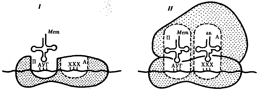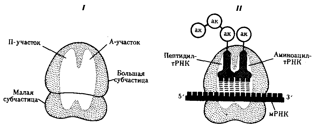 I - ненагруженная рибосома, II - нагруженная рибосома; ак - аминокислота