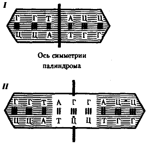 II - палиндром, в котором заштрихованный инвертированный повтор находится на расстоянии от оси симметрии