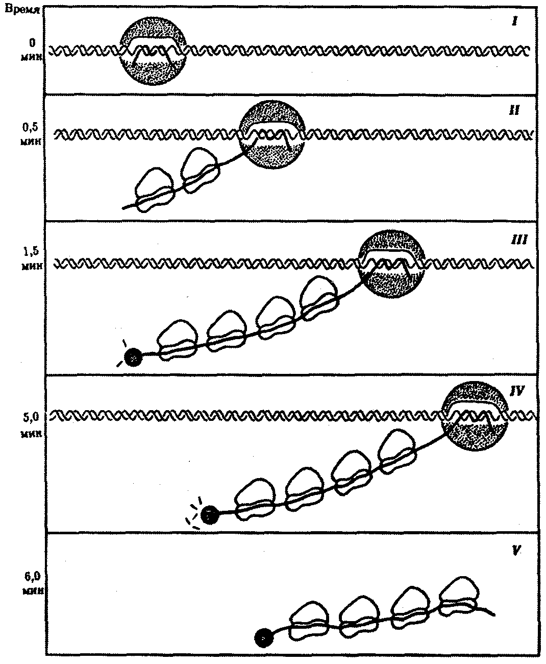 III - группа рибосом следует за РНК-полимеразой, на 5'-конце мРНК начинается ее деградация;