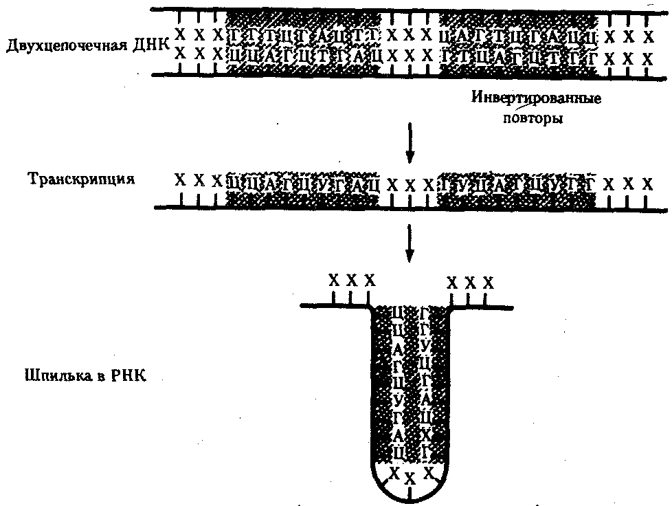 Рис.38. Образование шпильки участком РНК при терминации транскрипции у прокариот