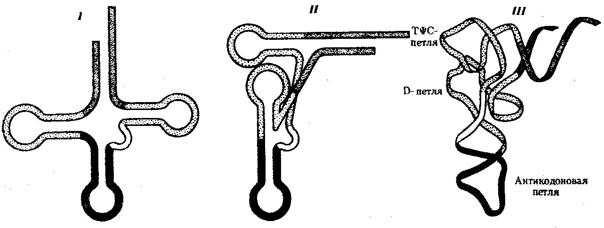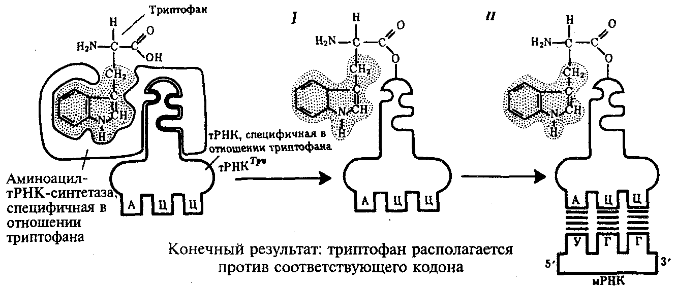 Рис.30. Схема трансляции генетического кода: I - присоединение аминокислоты (триптофана) к соответствующей тРНК с помощью фермента аминоацил-тРНК-синтетазы; II - присоединение тРНК, несущей свою аминокислоту, к мРНК благодаря связыванию ее антикодона с кодоном мРНК