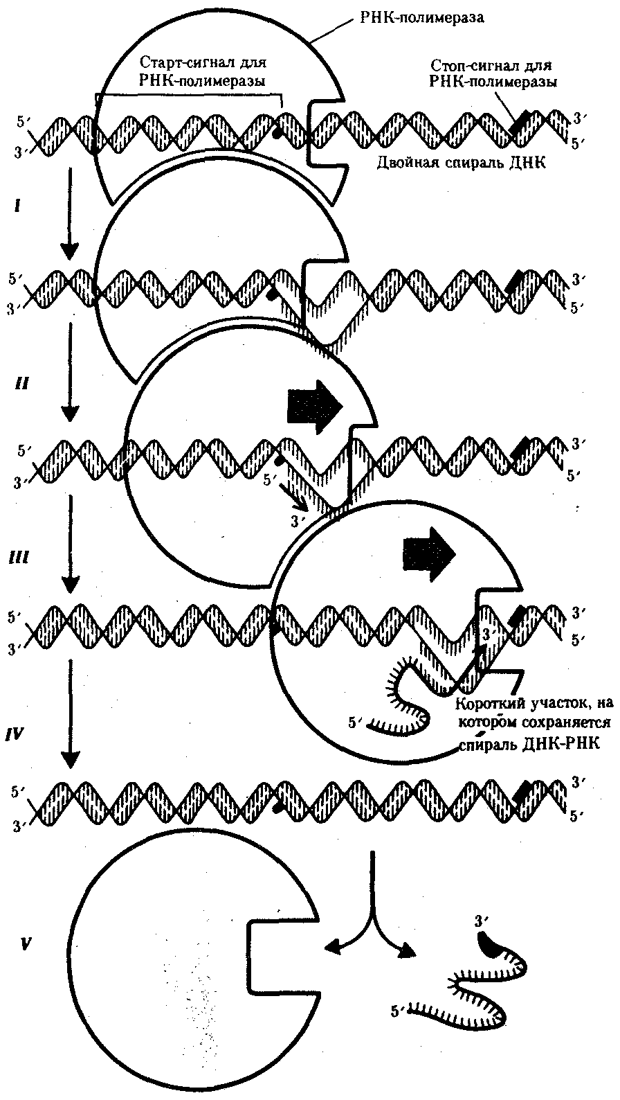 V - после окончания транскрипции мРНК освобождается от ДНК, на ней продолжается трансляция и деградация на 5'-конце